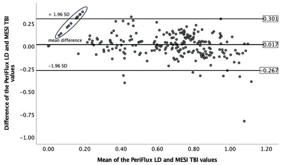 The Bland–Altman analysis showed a mean difference of 0.017 between the TBI assessment using the PeriFlux LD and the MESI measurements. The limits of agreement covered a range from −0.267 to 0.301. The circled section on Figure 5 demonstrates 11 cases in which the PeriFlux LD measured a numerical value, but the MESI device did not detect a pulse wave on the affected toe.