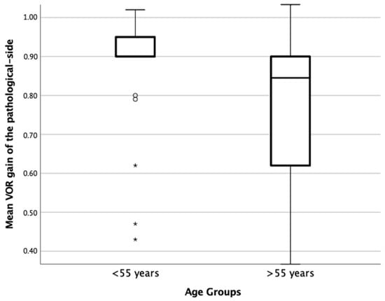 Mean VOR gain at the one-year follow-up between age groups. Circles represent the outliers and asterisks represent the extreme values. Both of these indicate patients with a VOR gain below 0.80, which is considered pathological.