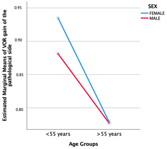 Estimated marginal means of VOR gain at the one-year follow-up demonstrated interaction between age groups and sex.