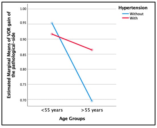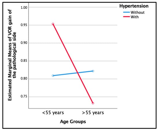 Estimated marginal means of VOR gain at the one-year follow-up demostrated interaction between age groups and hypertension in females.