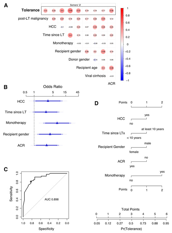 Development of a score to predict the probability of tolerance after discontinuation of immunosuppression in long-term liver transplant patients. (A) Pairwise analysis of variables included for multivariable prediction and with tolerance as response (top row). Association between variables is measured by Somers’ D rank correlation. (B) Adjusted odds ratios (OR) estimated by penalized multivariable logistic regression analysis are shown for monotherapy, recipient gender, presence of an HCC in the explant, absence of acute cellular rejection, and time since LT. These five predictors were retained in a simplified model that approximates the full model. Effects are shown for the approximate model. Blue of different transparencies indicates 90, 95, and 99% confidence levels. (C) Receiver operator characteristic curve for prediction of tolerance using the simplified logistic regression model with approximate coefficients for five variables depicted in (B). AUC, area under the curve. The circle indicates sensitivity and specificity for a classification threshold of 0.635 probability. Diagonal segments are produced by ties. (D) Nomogram of the approximate predictive model. A points score is calculated based on predictor values to estimate the clinical probability of tolerance.