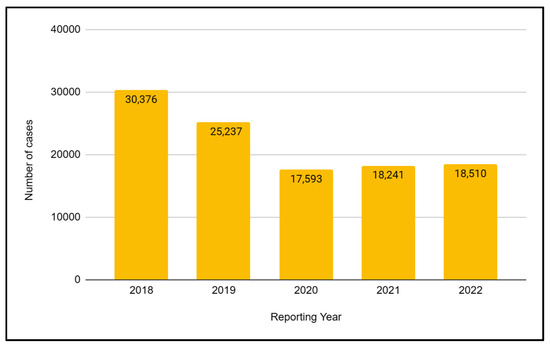 From 2015 to 2018, a decrease in the total number of tuberculosis cases could be observed in Ukraine. In 2018, 25% fewer cases were recorded compared to 2015. This decrease was mainly due to greater efforts made by the state authorities to fight tuberculosis. 2020 turned out to be the year with the lowest number of cases in years. This was most likely the result of the outbreak of the COVID-19 pandemic and limited access to health services, so the number of cases is underestimated. The next two years were associated with an increase in reported cases of tuberculosis. The Public Health Center in Ukraine reported that in 2022, 18,510 cases of tuberculosis were registered in the country, which is a significant increase of over 2.5% compared to 2021 (Figure 1).