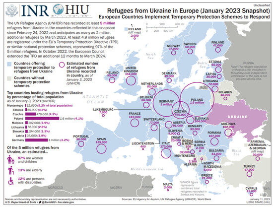 Refugees from Ukraine in Europe. Source: Refugees from Ukraine in Europe (January 2023 Snapshot)—European Countries Implement Temporary Protection Schemes to Respond https://reliefweb.int/report/world/refugees-ukraine-europe-january-2023-snapshot-european-countries-implement-temporary-protection-schemes-respond, (accessed on 13 Jan 2023).