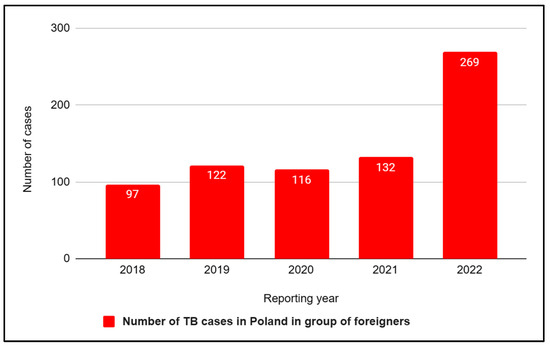 Number of tuberculosis (TB) cases in Poland in group of foreigners in 2018–2022.