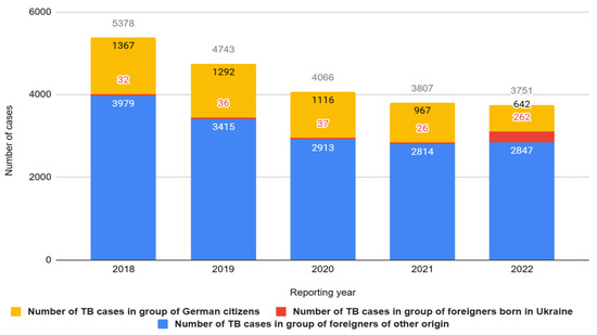 Despite the overall decrease in tuberculosis (TB) incidence between 2018 and 2022 in Germany, a concerning trend is the rising proportion of foreign nationals among TB patients. In 2022 alone, Germany saw an influx of nearly one million individuals of Ukrainian origin. In light of the ongoing war and intensified migratory movements, an increase in tuberculosis (TB) cases among foreigners has been observed within the territory of Germany. This trend is particularly pronounced among individuals immigrating from Ukraine. In 2022, there were 2847 reported cases of TB among foreigners, with 262 of these cases among the Ukrainian population—an increase of 236 cases compared to the previous year. The reported TB case numbers for the years 2020–2022 may be slightly underestimated due to the ongoing COVID-19 pandemic and limited access to healthcare. Therefore, the actual number of cases is likely higher (Figure 5).