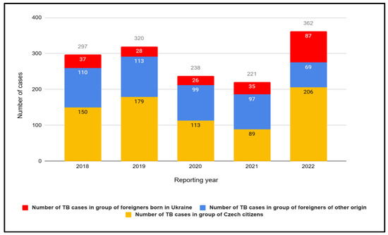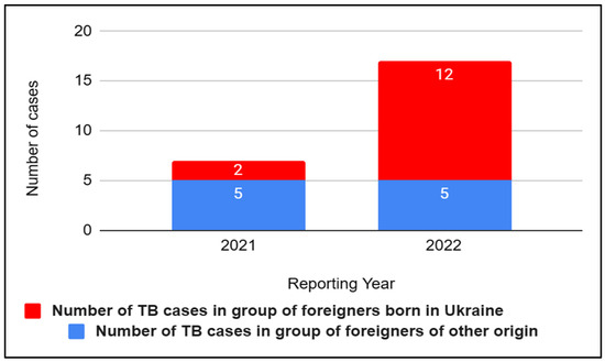 Similar to Poland and Germany, in the Czech Republic, there has been an observed increase in tuberculosis (TB) cases among foreigners during the period of 2018–2022. In 2022, the highest number of cases among individuals from outside the country was recorded in the past 5 years—156 cases, including a significant 87 cases among the Ukrainian population, which is over twice as many as the previous year (Figure 6). Despite the relatively low overall number of cases within the Czech territory, the alarming aspect is the rapid growth of reported tuberculosis cases among foreigners.
