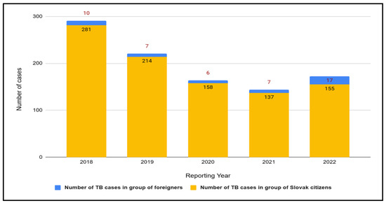 Number of tuberculosis (TB) cases in Slovakia in groups of Slovak citizens and foreigners in 2018–2022.