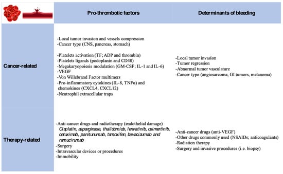 Cancer and therapy-related factors responsible for hemostasis disruption, favoring thrombosis and/or bleeding.