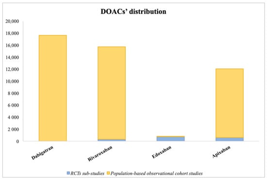 The largest study included 196,521 patients [], while the smallest included 224 patients []. Five studies did not include edoxaban [,,,,], and consequently, it was the least represented DOAC among these cohort studies, while the most represented was apixaban (Figure 2). Four authors performed a propensity score (PS) matched analysis paring warfarin patients with similar DOAC patients [,,,]. Two articles also performed DOAC–DOAC comparisons for primary safety and efficacy outcomes [,,].