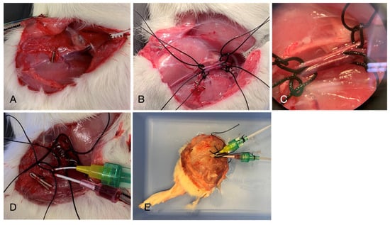 (A) Clipping of the superficial epigastric artery after inguinal vascular access. (B) Dissection of the femoral artery and vein. (C) Microsurgical preparation for the arteriotomy and venotomy with ligatures. (D) Cannulation of femoral artery and femoral vein with #3 French venous catheters via Seldinger method. (E) Completely cannulated limb flushed with heparinized saline.