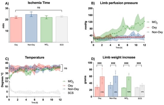 Over the course of 12 h perfusion, limb weight increased significantly, by at least 81% (Oxy group) and up to 124% (MO2 group) in the perfusion groups and by 27% in the SCS group, as depicted in Figure 2D. Differences were not significant among the perfusion groups.