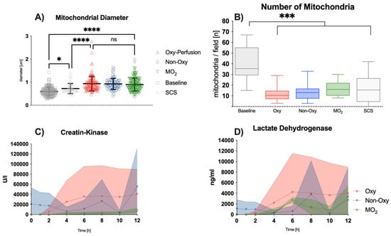 (A) Mitochondrial diameter (um) at timepoint 12 h; significant increase compared to baseline in the SCS group [* p = 0.0009] and compared to all perfusion groups [**** p < 0.0001]; significantly lower diameter in the SCS group compared to all perfusion groups [**** p < 0.0001]; ns = not significant. (B) Number of mitochondria after 12 h of perfusion [*** p < 0.0001]; for better readability, brackets between the perfusion groups indicating “ns” were omitted. (C) Levels of creatine kinase over 12 h; no significant differences among the perfusion groups were noted. (D) Levels of lactate dehydrogenase over 12 h; no significant differences among the perfusion groups were noted.