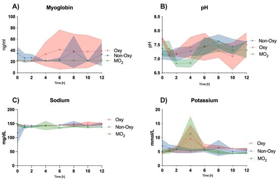 Analysis of the perfusion solutions for (A) levels of myoglobin (ng/mL) over 12 h; (B) pH levels over 12 h; (C) sodium levels (mg/dL) over 12 h; (D) potassium levels (mmoL/L) over 12 h. Statistical differences were not observed in (A–D).