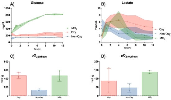 The pH levels were consistent throughout the experimental course, appearing increasingly physiological after 6 h, after an initial decrease to acidic values for the first 4 to 6 h in all groups (Figure 5B). Sodium levels averaged around physiological values of 141.5 ± 9.8 mg/dL amongst all perfusion groups (Figure 5C), while potassium level measurements were in hyperkalemic ranges, with mean values of 6.28 ± 2.1 in the Oxy group, 5.76 ± 1.32 in the Non-Oxy group, and 5.84 in the MO2 group. Notably, potassium levels peaked in the Oxy group and the MO2 group at 4 h, then decreased to levels observed at timepoint 0 (Figure 5D). Glucose levels were lowest in the Non-Oxy group, followed by the Oxy group. In the MO2 group, a continuous increase in glucose levels was measured over the course of 12 h (Figure 6A), with significantly higher values as compared to the Oxy (p = 0.0010) and Non-Oxy (p = 0.0041) groups.