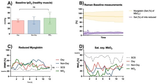 (A) Levels of tissue pO2 in healthy muscle in mmHg; ns = not significant. (B) Exemplary Raman spectroscopy measurements in healthy muscle before amputation. (C) Levels of 3RMR (%); no significant differences were noted. (D) Levels of MbO2 (%); no significant differences were noted.