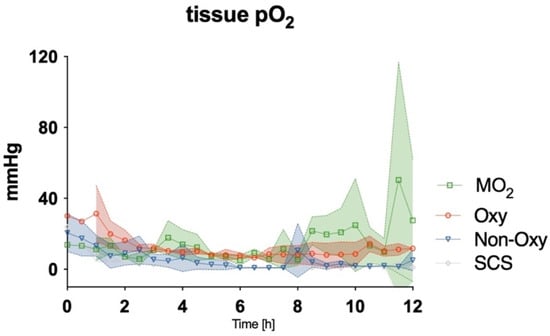 Levels of tissue pO2 in skeletal muscle in mmHg over the course of 12 h. Significant differences between all groups were not detected.