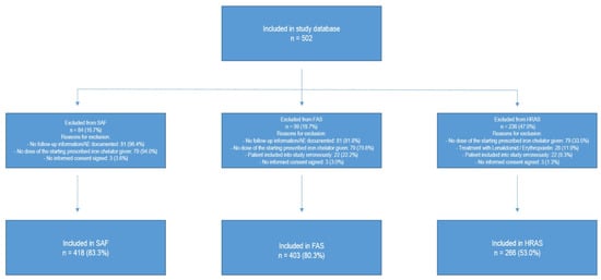 Overall, 502 patients were enrolled in the study database, with 418 patients in the safety analysis set (SAF), 403 patients in the full analysis set (FAS), and 266 patients in the hematological response analysis set (HRAS). Reasons for exclusion from the different analysis sets are shown in Figure 1. Of the 106 registered study sites, 101 sites had at least one patient included in the SAF, and 98 sites had at least one patient included in the FAS. Median age of patients at baseline was 75 years (ranging from 24 to 92) with a higher proportion of males (59.6%). Patient demographics and disease characteristics are shown in Table 1. The most common hematologic diagnosis was MDS (61.0%), followed by MPN (16.1%). Subtypes of MDS and MPN diagnoses are shown in Table 2, with MDS with multilineage dysplasia (MDS-MLD, 19.5%), MDS with excess of blasts I (MDS-EB I, 13%), and MDS with single lineage dysplasia and ring sideroblasts (MDS-SLD-RS, 12.2%) being the most frequent subtypes of MDS, and primary myelofibrosis for MPN (63.1% of MPN patients). The median time from first diagnosis to current iron chelation therapy was 21.6 months (with an interquartile range of 8.6 to 50 months), and only 5.2% of patients had iron chelation therapy prior to study inclusion. The vast majority of patients had concomitant diseases like hypertension (50.4%), coronary artery disease (11.9%), or diabetes (10.2%), as well as concomitant medication (94.0%). The median time from primary diagnosis to receiving transfusions was 2.8 months (interquartile range 8.6 to 50 months), and the median time from start of transfusions to start of current iron chelation therapy was 12.1 months. More than 95% of patients had received at least one red blood cell transfusion prior to study entry, while most of the patients had received less than 20 erythrocyte concentrates (47.3%) prior to study entry.