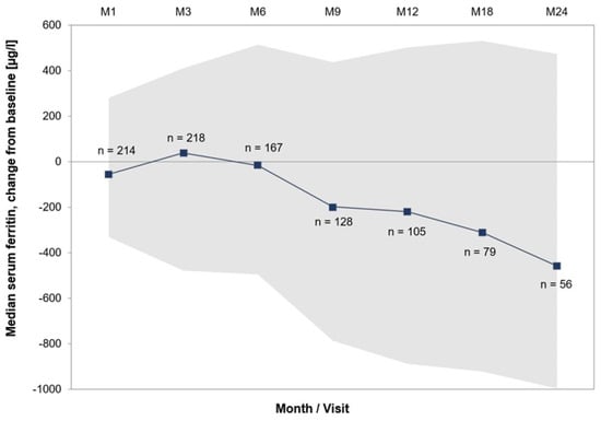 The median serum ferritin value decreased notably throughout treatment, with 1802.50 µg/L at baseline and 1240.50 µg/L at month 24. The median change from baseline at month 24 was −458.0 µg/L; the change from baseline throughout treatment is shown in Figure 2. At baseline, patients had received a median of 4 (IQR: 3-8) erythrocyte concentrates within the last 8 weeks. At all subsequent visits throughout the initial treatment, patients had received a median of 6 erythrocyte concentrates within the last 8 weeks.