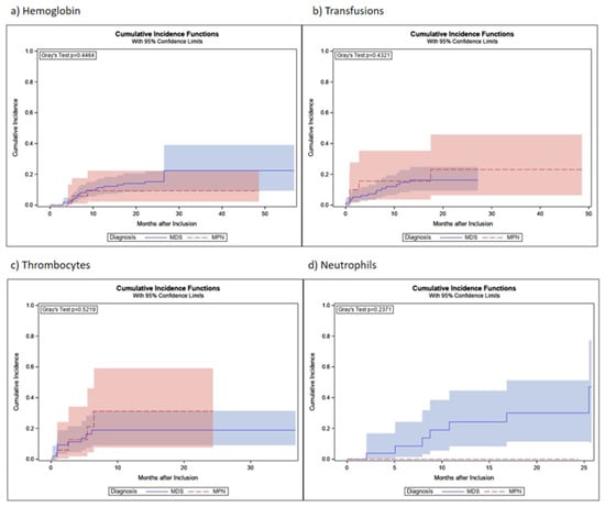 Changes in blood parameters were estimated based on mixed linear models using the time as independent variable and the patient as random. Cumulative incidence at 24 months for hemoglobin response was 15.2% (95% CI: 9.6–22.0%) for MDS patients and 9.3% (95% CI: 2.3–22.4%) for MPN patients with increasing mean hemoglobin values from 8.3 (95% CI: 8.2–8.5) to 8.9 (95% CI: 8.5–9.2) g/dL for MDS patients and from 8.3 (95% CI: 8.0–8.7) to 8.9 (95% CI: 8.4–9.3) g/dL for MPN patients. Cumulative incidence at 24 months for transfusion response was 16.3% (95% CI: 9.4–24.8%) for MDS patients and 23.1% (95% CI: 6.4–45.9%) for MPN patients. Mean platelet values decreased from 145.4 (95% CI: 127–166) to 103.4 (95% CI: 85–125) × 103/µL for MDS patients and from 112.7 (95% CI: 84–151) to 80.2 (95% CI: 58–111) × 103/µL for MPN patients. Nonetheless, 24-month cumulative incidences of platelet response were 18.9% (95% CI: 9.1–31.5%) for MDS patients and 31.2% (95% CI: 7.6–59.1%) for MPN patients. Cumulative incidence at 24 months for neutrophil response was 30.0% (95% CI: 11.4–51.3%) for MDS patients, while none was observed in the MPN patients, with mean neutrophil values that increased from 3.0 (95% CI: 2.8–3.3) to 3.4 (95% CI: 2.9–3.9) × 103/µL for MDS patients, and from 5.3 (95% CI: 4.3–6.5) to 5.9 (95% CI: 4.7–7.5) × 103/µL for MPN patients (Table 6). Cumulative incidences of hematological responses, as well as cumulative incidence curves regarding time to hematological response, are shown in Table 6 and Figure 3. We observed 30 responses regarding hemoglobin, of which 6 were lost during the observation time. Eight out of 19 patients who showed transfusion response lost that response during the course of the study, while 3 out of 13 patients lost their response regarding transfusions. All patients who showed neutrophil response maintained that response until the end of the observational period.
