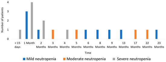 In the literature, the incidence of leukopenia (used as the main marker of myelotoxicity) is approximately 3% per patient per year of follow-up, with a cumulative incidence of 7% reported []. These data are lower than those detected in our series, where the occurrence of neutropenia was 21%. This may be explained by the fact that the presence of neutropenia is not always accompanied by absolute leukopenia, so studies evaluating this parameter may be underestimating the prevalence of myelotoxicity. In our study, 5 of the 21 cases of neutropenia had a leukocyte count within the normal range. In addition, differences between studies are also due to the disparity between cut-off points between countries and even between hospitals and laboratories for defining pathological values. In the systematic review by Gisbert J.P. et al. [], the cut-off point for neutropenia was generally found to be 1.5 × 109/L, lower than in the present study, which was 2 × 109/L. In our study, eight cases of severe neutropenia (8.2%) were detected, in most cases leading to the discontinuation of treatment. The data are higher than those reported in the literature, where severe leukopenia rates of up to 5.7% are defined [,,]. These differences may be due to the sample size of the studies (8300 patients in a systematic review of 66 studies of Gisbert J.P. et al. vs. 98 in our study). Although myelotoxicity can occur at any time after drug initiation, the literature describes that it mostly occurs after the first weeks or months of treatment []. These data are consistent with those obtained in our study, where most neutropenia cases were recorded in the first nine months of treatment and no severe neutropenia was observed beyond 5 months.