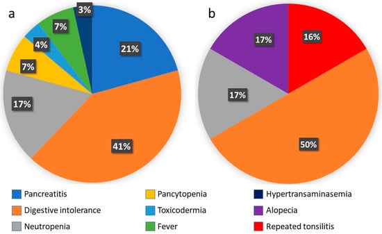 In 11 patients, thiopurine was switched from azathioprine to mercaptopurine (9 due to digestive intolerance, 1 after an episode of fever of unknown origin, and 1 due to toxicodermia). Among these, adverse effects of mercaptopurine were detected in six patients (54.5%); all of them led to discontinuation of the drug, including three patients due to persistent digestive intolerance (50%), one case of severe neutropenia (16.6%), one case of recurrent tonsillitis (16.6%), and one case of alopecia (17%) (see Figure 2b for details).