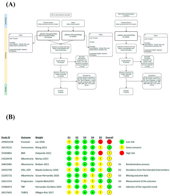 The main limitation of the search for risk factors associated with the development of DR presents complications in terms of systematic reviews focused on a specific population. Due to the lack of studies that provide specific or similar information, in some cases the small population N and insufficient data on clinical features, among others, make it difficult to analyze possible risk factors that could be involved in the diagnosis or prevention of DR. Furthermore, the lack of specific research in each Latin American country makes it difficult to correlate and compare different ethnic groups; the low participation of governmental and nongovernmental institutions causes a delay in the analysis and publication of research on DR [42] that would be of vital importance for the treatment or prevention of this condition.