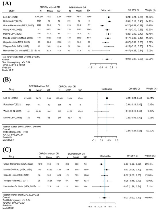 DBP in DR. Forest plot of DBP between diabetic patients with and without DR. The presence of elevation in DBP is not a risk factor for presenting DR (p = 0.34) (A). The exclusion of Latin America with elevated DBP is a factor in the appearance of DR (p < 0.001) (B). In contrast, the Latin American analysis did not show a significant difference between DBP pressures and the presence of DR (p = 0.54) (C). Maximum Likelihood Model (MLE) [32,33,34,35,36,37,38,39,41].