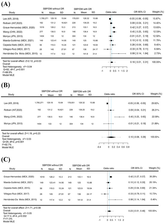 SBP increased in GL but not in LA and non-LA. A forest diagram of SBP between patients with and without DR. The presence of elevation in SBP is a risk factor for the development of DR (p = 0.03) (A). With the exclusion of Latin America, elevated SBP was not a risk factor for the appearance of DR (p = 0.23) (B). As in the Latin American population, there was no significant difference between SBP pressures and the presence of DR (p = 0.08) (C). Maximum Likelihood Model (MLE) [32,33,34,35,36,37,38,39,41].