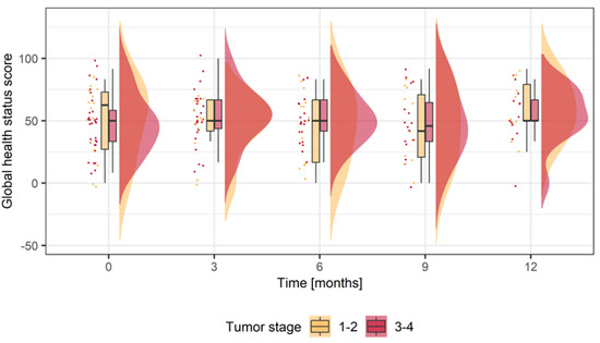 Score values for global health status in small recurrent tumors (Stage 1–2; yellow) and advanced recurrent tumors (Stage 3–4; red). Boxplots display mean scores prior to surgery (0 = baseline) and different timepoints during follow-up for up to one year (12 = months postoperatively). The dots display the factual score values (Stage 1–2; yellow; Stage 3–4; red). The curve represents the density function (Stage 1–2; yellow; Stage 3–4; red).