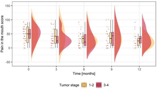 Score values for pain in the mouth in small recurrent tumors (Stage 1–2; yellow) and advanced recurrent tumors (Stage 3–4; red). Boxplots display mean scores prior to surgery (0 = baseline) and different timepoints during follow up for to one year (12 = months postoperatively). The dots display the factual score values (Stage 1–2; yellow; Stage 3–4; red). The curve represents the density function (Stage 1–2; yellow; Stage 3–4; red).