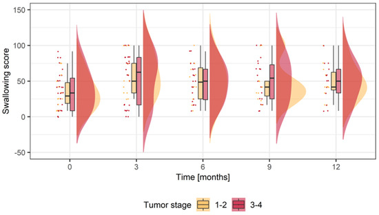 Score values for swallowing in small recurrent tumors (Stage 1–2; yellow) and advanced recurrent tumors (Stage 3–4; red). Boxplots display mean scores prior to surgery (0 = baseline) and different timepoints during follow-up for to one year (12 = months postoperatively). The dots display the factual score values (Stage 1–2; yellow; Stage 3–4; red). The curve represents the density function (Stage 1–2; yellow; Stage 3–4; red).