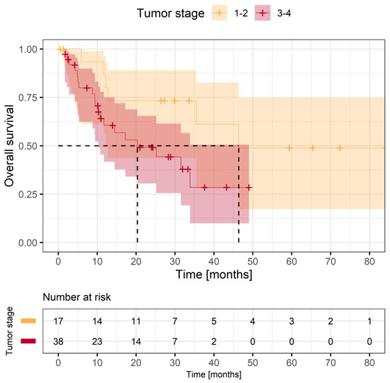 Overall survival with regard to tumor stage (Stage 1–2; yellow vs. Stage 3–4; red); Log-rank test, p = 0.054. Dashed line indicates median survival.