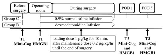 To the best of our knowledge, no randomized controlled trials in humans have evaluated the effect of the administration of dexmedetomidine on HMGB1 levels in relation to cognitive decline. Therefore, we hypothesized that the infusion of dexmedetomidine can reduce the incidence of PND and aimed to investigate the HMGB1 levels and evaluate the perioperative cognitive function using the Mini-Cog© score in elderly patients undergoing orthopedic surgery under general anesthesia with or without dexmedetomidine infusion.