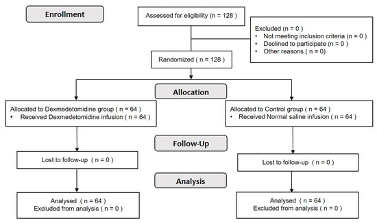 In total, 128 patients who underwent orthopedic surgery under general anesthesia were included in this study and randomly allocated to two groups: Group C (n = 64) and Group D (n = 64). A flow diagram of the Consolidated Standards of Reporting Trials (CONSORT) is presented in (Figure 2).
