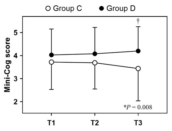 A comparison of inter-group differences revealed that the changes in the Mini-Cog© score over the study period showed a statistically significant difference between the groups, indicating that the Mini-Cog© score in Group D showed an increasing pattern, whereas that in Group C showed a decreasing pattern over time despite both groups having similar preoperative Mini-Cog© scores (p = 0.008). Following the Bonferroni test for post hoc analysis, the T3 Mini-Cog© score of Group D differed significantly from that of Group C (p = 0.001) (Figure 3). The Mini-Cog© scores differed significantly between the two groups at each time point: 3.72 ± 1.19 vs. 4.03 ± 1.13, p = 0.129 at T1; 3.69 ± 1.14 vs. 4.08 ± 1.15, p = 0.055 at T2; 3.44 ± 1.40 vs. 4.20 ± 1.06, p = 0.001 at T3 in Group C and Group D, respectively. Comparison of the intra-group differences revealed that the differences in the Mini-Cog© scores were comparable between two time points: 0.031 vs. 0.047 from T1 to T2, 0.281 vs. 0.172 from T1 to T3, and 0.250 vs. 0.125 from T2 to T3 in Group C and Group D, respectively (Table 3, upper panel).