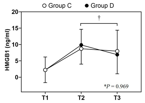 Analysis of the serum HMGB1 levels. The values are presented as mean ± SD. Repeated measures of two-way analysis of variance (ANOVA) and Bonferroni post hoc test were performed for the serum HMGB1 levels. When comparing the groups, the changes in the serum HMGB1 levels did not differ significantly over time (p = 0.969). The HMGB1 levels at T2 and T3 were significantly higher than those at T1 in both groups. The mean difference in the HMGB1 levels between T2 and T3 was statistically significant in Group D (p = 0.004) but not in Group C (p = 1.000). T1, before the surgery; T2, postoperative day 1; T3, postoperative day 3; Group C, control group; Group D, dexmedetomidine group; * p = 0.969 (intergroup difference over time). † p = 0.004 (comparison from T2 to T3 in Group D).