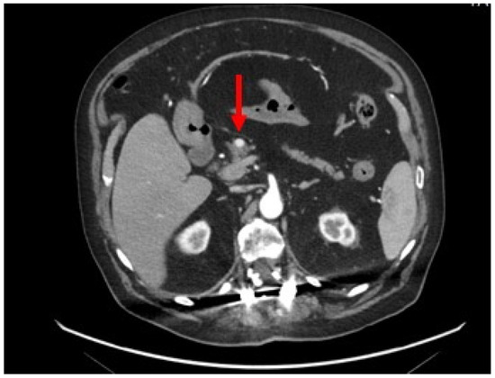 Contrast-enhanced abdominal CT scan: axial section showing a homogeneous and hypervascular mass of 8 mm (red arrow) on the arterial phase.