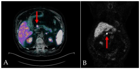 68Ga-DOTA-TOC integrated PET/CT scans, transaxial (A) and MIP (B), show focal and intense uptake in the primary pancreatic lesion (red arrows), with an elevated expression of SSTR2/5 somatostatin receptors.