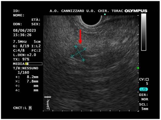 Endoscopic ultrasound (EUS) image (red arrow) of a small hypo-echogenic lesion with a regular margin and a major axis of 8.9 mm.