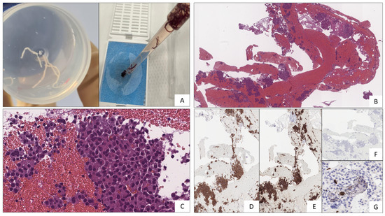 (A) Microcores of sample tissue. (B) Abundant blood and entrapped epithelial elements of pancreatic tissue stained with Hematoxylin–Eosin. (C) Epithelial cells, with a granular cytoplasm and nuclei with thickened chromatin (Hematoxylin–Eosin staining). (D) Chromogranin A (5H7 clone, immunohistochemical staining). (E) Synaptophysin (27G12 clone, immunohistochemical staining). (F) Serotonin (YC5/45 clone, immunohistochemical staining). (G) Ki67 (MM1 clone, immunohistochemical staining).
