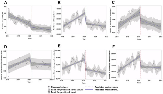 Interrupted times series analysis of chronic rhinosinusitis (CRS) incidence rates and healthcare utilization for CRS. Observed values and predicted trends in each primary endpoint parameter are depicted. (A) Monthly age- and sex-specific incidence rates per 100,000 population. (B) Monthly number of outpatients. (C) Monthly number of hospitalized patients. (D) Monthly number of patients who underwent surgery. (E) Monthly number of patients prescribed antibiotics. (F) Monthly number of patients prescribed steroids.
