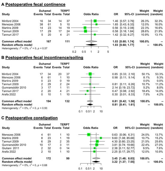 3.3. Postoperative Fecal Continence, Fecal Incontinence/Soiling, and Constipation