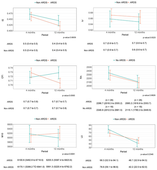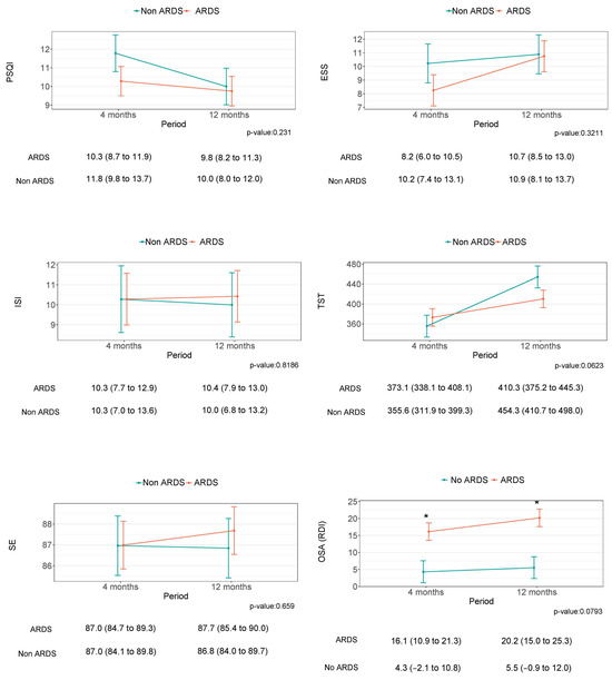 Comparisons of sleep and circadian-related parameters between the study groups (ARDS and non-ARDS) at the twelve-month follow-up were performed with unadjusted and adjusted logistic or linear models (depending on the characteristics of the outcome). Age, sex, and BMI were considered as confounding factors in the adjusted models. Changes in sleep and circadian-related parameters over time (between the four- and twelve-month follow-up), stratified by the study groups (ARDS and non-ARDS), were assessed using generalized linear mixed-effect models adjusted for confounding factors (age, sex, and BMI), including the patient as a random effect. The differences between the groups of study (ARDS and non-ARDS) at each time point (four- and twelve-month follow-up) were assessed for interaction between the group and time. The p-value threshold defining statistical significance in all the analyses was set at 0.05. Data management and statistical analyses were performed using R (version 4.0.2; R Foundation for Statistical Computing).