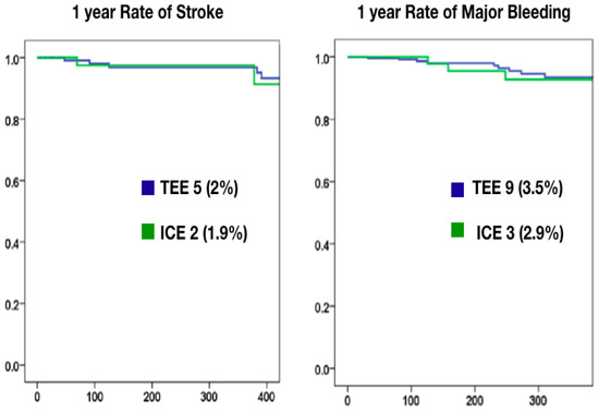- Nielsen-Kudsk, J.E.; Berti, S.; De Backer, O.; Aguirre, D.; Fassini, G.; Cruz-Gonzalez, I.; Grassi, G.; Tondo, C. Use of Intracardiac Compared with Transesophageal Echocardiography for Left Atrial Appendage Occlusion in the Amulet Observational Study. JACC Cardiovasc. Interv. 2019, 12, 1030–1039. [Google Scholar] [CrossRef] [PubMed]