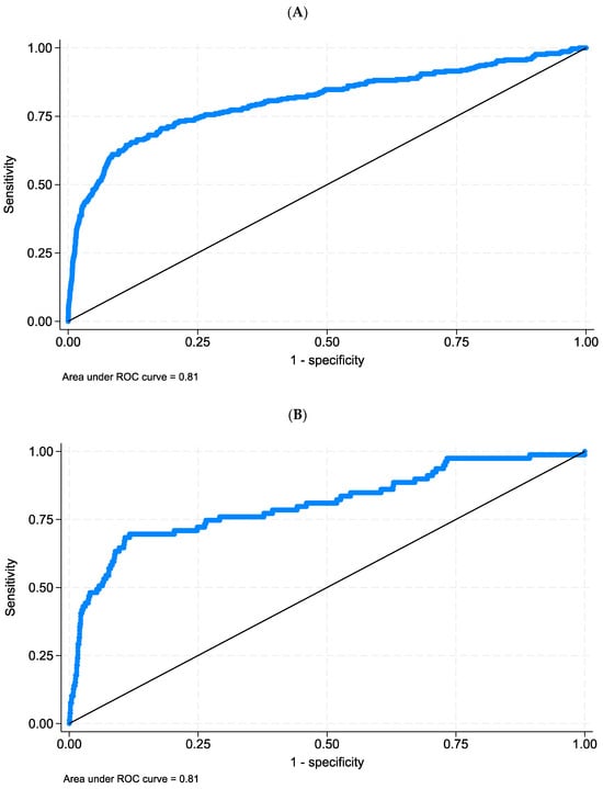 To assess the robustness of the model’s predictive performance, the original sample was randomly split into a training set (75% random selection of the whole sample) and testing set (the remaining 25% of the whole sample). The model was re-estimated on the training set, and the predictive performance was assessed on the testing set for internal validation by the area under the ROC curve and the likelihood ratio test based on the calibration belt method. Data were analyzed with STATA 16 ® (StataCorp LLC, College Station, TX, USA).