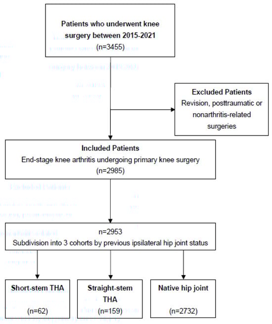 Our study had several limitations to consider. First, there was a potential confounder caused by the different time period between the expression of knee arthritis in the short-stem and the straight-stem cohorts. Short-stem THA has not been established as long as straight-stem THA and, therefore, it has had a shorter observation period. To enable a comparison, sub-cohorts were formed from straight-stem and short-stem patients who had comparable times of follow-up after index hip surgery. Second, the analysis was designed retrospectively and, therefore, we could not ensure the highest level of evidence. Third, there was no measurement of HKAA before hip surgery in THA subjects, which would have enabled more accurate data.