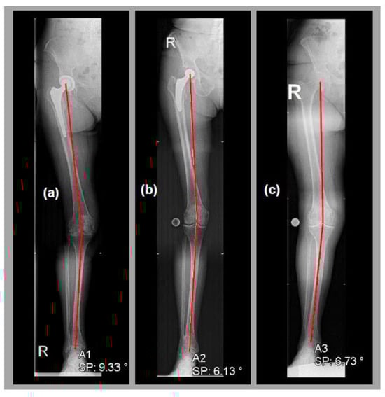 HKAA, defined as the angle between the mechanical axis of the femur and tibia, was calculated []. The Mikulicz line is a straight line from the femoral head rotation center to the middle of the talus. Valgus malalignment is defined as a lateral pass of the Mikulicz line at the HKAA knee point, while in varus malalignment, the Mikulicz line passes the medial knee.