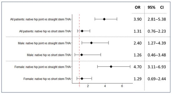 The odds ratios for all combinations are shown in Figure 3. The results again showed that the use of a straight-stem design significantly increased the risk of developing valgus alignment, compared to short-stem THA and native hip joints.