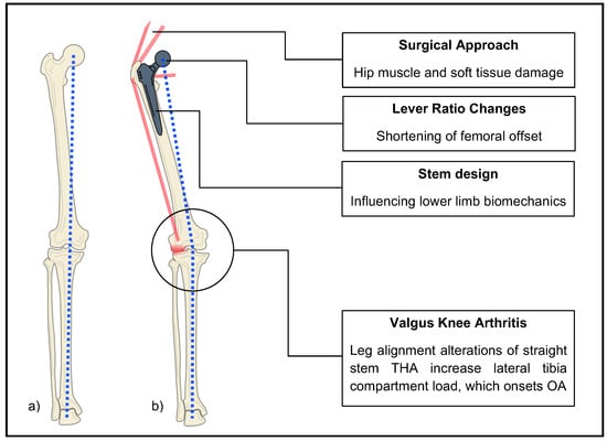 However, straight-stem THA has various impacts on the ipsilateral leg. After primary THA, the odds for subsequent knee arthroplasty range from 2.1% to 6.8% [,]. All observed changes caused by stem design, femoral lever ratio changes, and surgical approaches subsequently cause specific HKAA deviations and loadings []. Simultaneously, these specific changes are risk factors for OA development []. In valgus knee OA, these changes occur with a load accentuation on the lateral compartment of the tibia plateau. This is consistent with the lateralization of HKAA in ipsilateral straight-stem hips, which enhances the lateral load on the tibia plateau []. The formation pathways are shown in Figure 4.