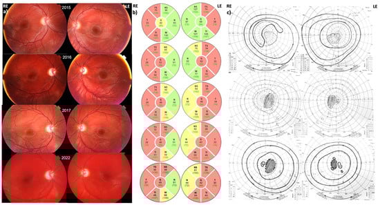 (a) Fundoscopy, (b) peripapillary RNFL, and (c) visual field of Patient 1 at presentation and during the 7-year follow-up period. Note the development of disc pallor in both eyes on the fundoscopy with progressive thinning of pRNFL (marked with red) and persistent central scotoma. Green fields represent parts that still have normal or thickness greater than normal, yellow fields have a borderline thickness, and red fields mark thickness less than normal (atrophy of the peripapillary RNFL).